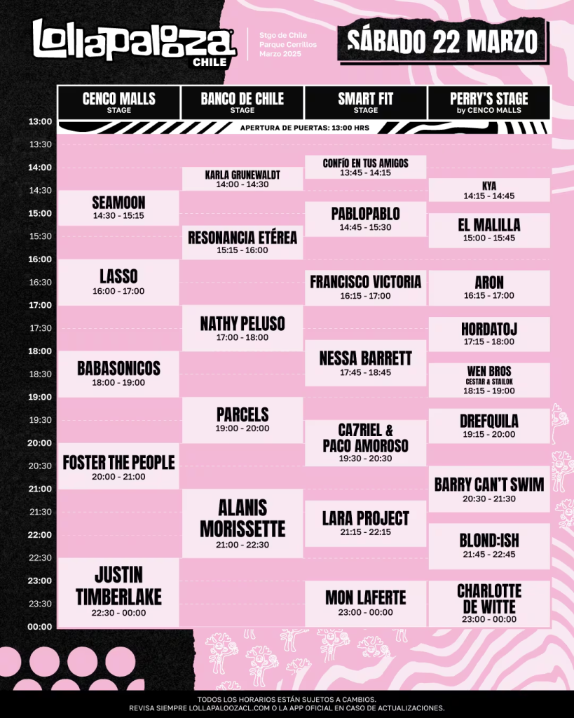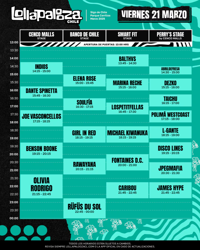 Lollapalooza Chile 2025 ya es una realidad, y durante este mediodía, la producción encargada del evento anunció finalmente el calendario completo de horarios y escenarios en los que se presentarán los artistas invitados a Lollapalooza Chile para que cada uno de los asistentes comiencen a organizar sus tres días llenos de música.
