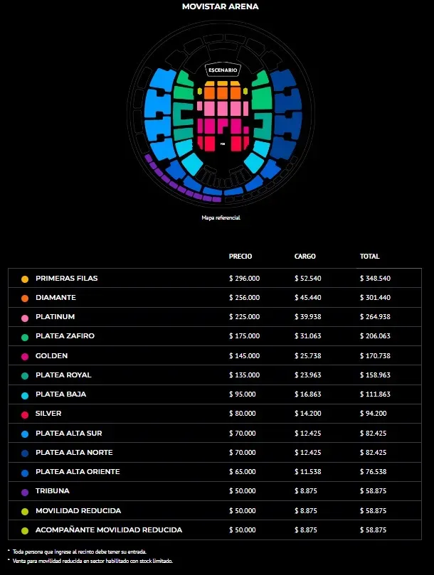 El valor de las entradas van desde los $58.875 correspondiente a Tribuna, seguido de Platea Alta Oriente a $76.538, Platea Alta Norte y Platea Alta Sur a $82.425. Silver tiene un valor de $94.200, Platea Baja y Platea Royal con un costo de $111.863 y $158.963.